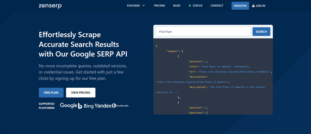 Zenserp provides APIs for multiple search engines, including Google. Setup is simple with API key authentication, and the service includes a Playground to configure requests and preview the output. Code snippets can be generated in several languages, but we noticed occasional syntax issues in the generated examples.