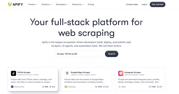 Apify operates as a cloud platform for running serverless automation scripts called “Actors,” rather than as a direct scraping API. This Actor model is powerful, offering deep control over behavior like concurrency, proxy rotation, and custom code injection via hooks (pre/postNavigationHooks). While its marketplace of pre-built Actors adds flexibility, the concept presents a steeper learning curve than a traditional REST API.