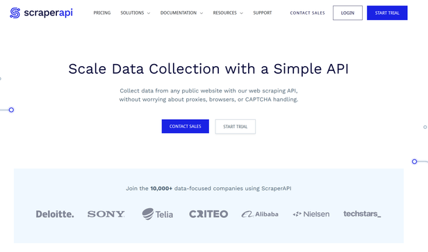 ScraperAPI is a straightforward service offering API key access with broad language support through its numerous official SDKs (Python, Node, Java, Ruby, PHP). It provides standard features like JS rendering, geo-targeting, and CAPTCHA handling. The platform also supports scheduled scraping jobs and webhooks, with screenshot capture available at an additional cost.