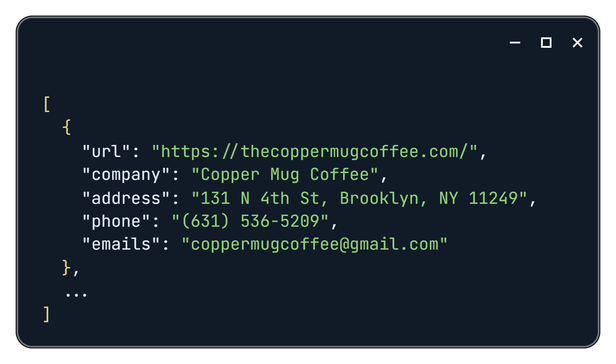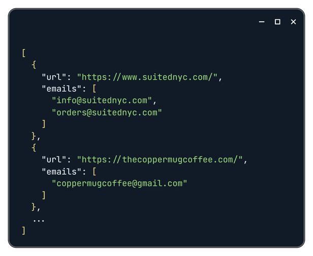 The API can use an LLM model to extract data from the page based on a natural language description. Right now, after running the script, you get JSON and CSV files with emails like this: