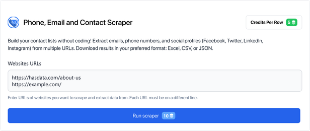 writer.writerow([result["url"], email])Replace the API key with your own HasData key, which you can get after signing up. Also, make sure you have a file called “urls.txt” in the same folder as the script. This file should have the list of domains you want to scrape.