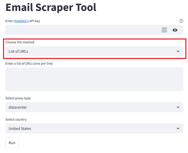 - List of URLs. Use this if you already have a list of sites to pull emails from.