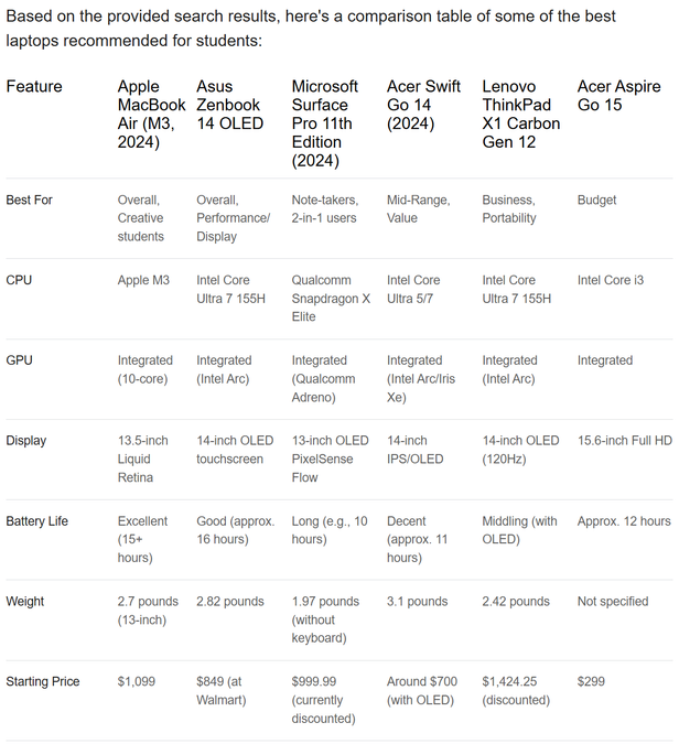 For a comparative query like “best laptops for students”, Google’s AI often generates a summary table.