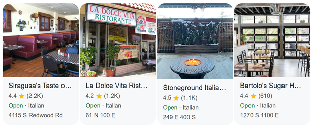 }For a location-based query like “italian restaurants near me”, the API extracts the businesses listed in the AI-driven local pack.