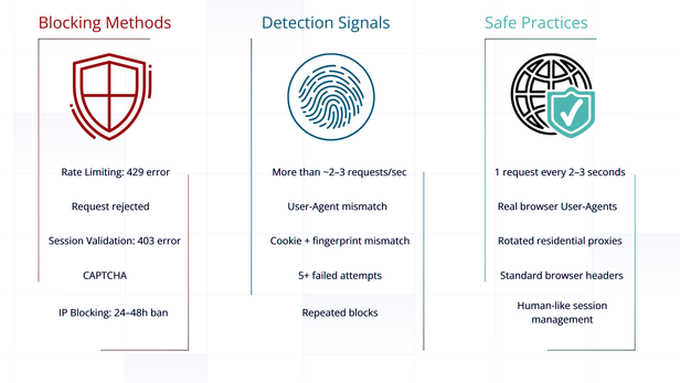 Scraping can trigger errors, captchas, refusals, or even bans. To stay safe, use tools that mask automation, add short random pauses between requests, and increase the delay if errors appear.