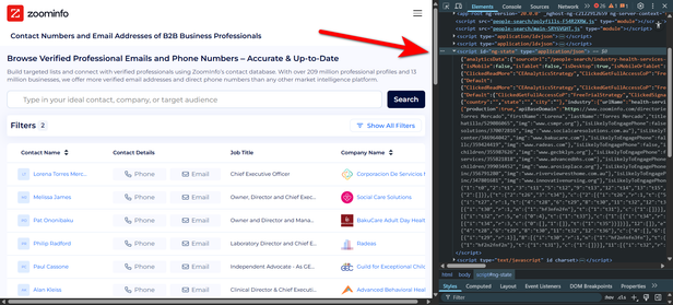 <script id="ng-state">JSON blob provides a stable API-like structure that doesn’t break when ZoomInfo changes its CSS classes. - Decoupling. Always separate your extraction logic (getting the JSON) from your parsing logic (cleaning the data). This allows you to update your parser without re-running the expensive scraping process.