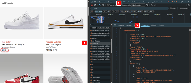- Search the response bodies for the price value (e.g., 1299 or the product SKU).