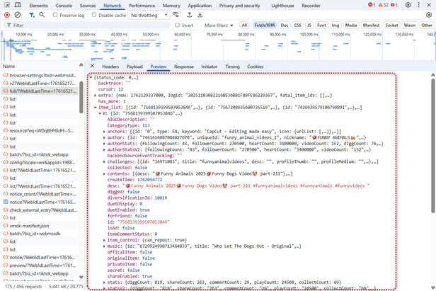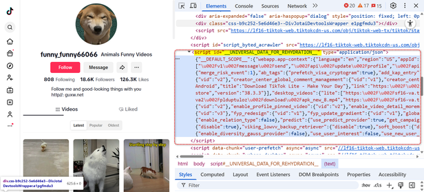 This works for profile data and individual video pages. For other pages, it’s often simpler to find the right endpoint that returns the required data: